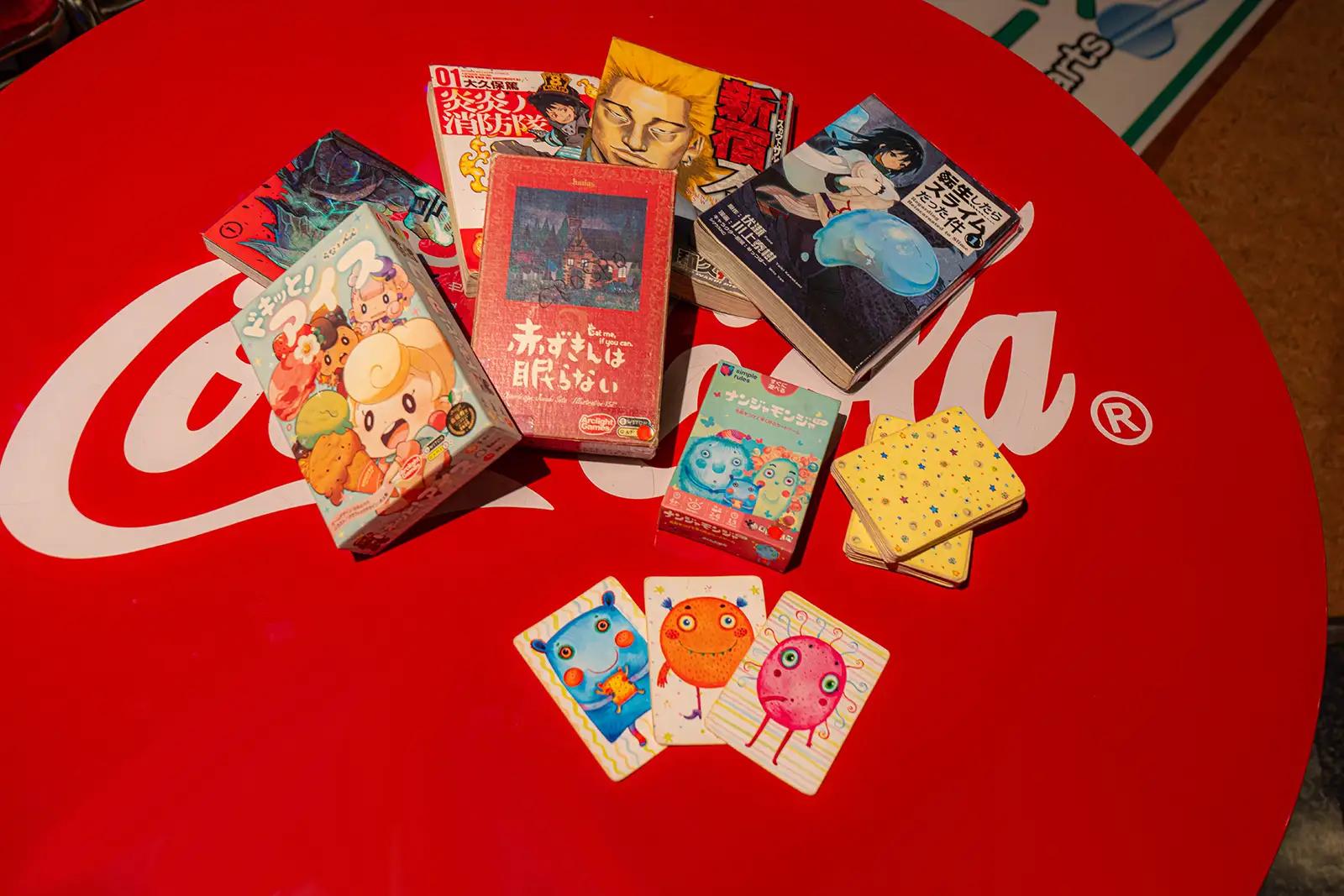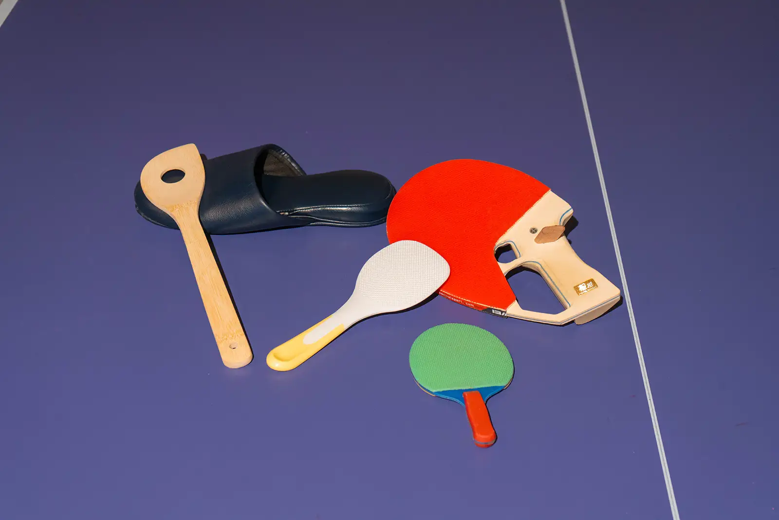 得点表はもちろん、定番のスリッパやしゃもじなど、ユニークなラケットも充実。