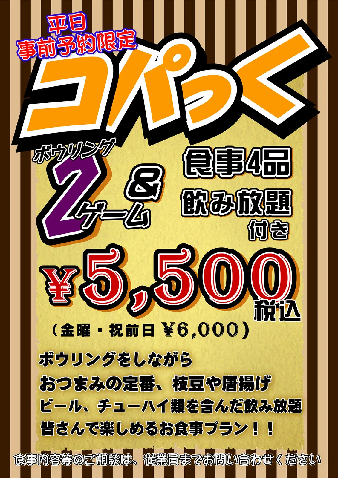 ボウリングを楽しみながら、しっかり食事&飲み放題を満喫!