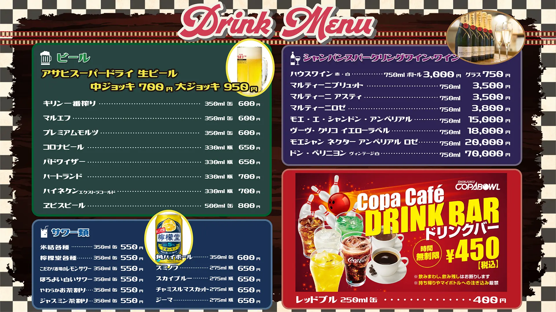 生ビールやソフトドリンクを含む20種類以上のメニューからお選びいただけます。