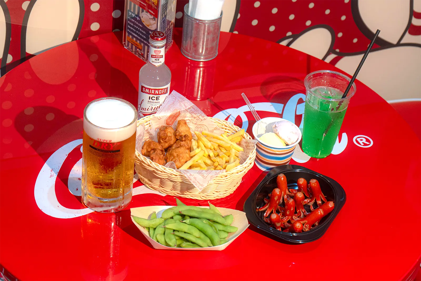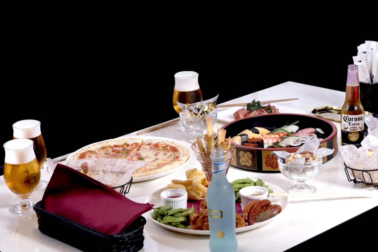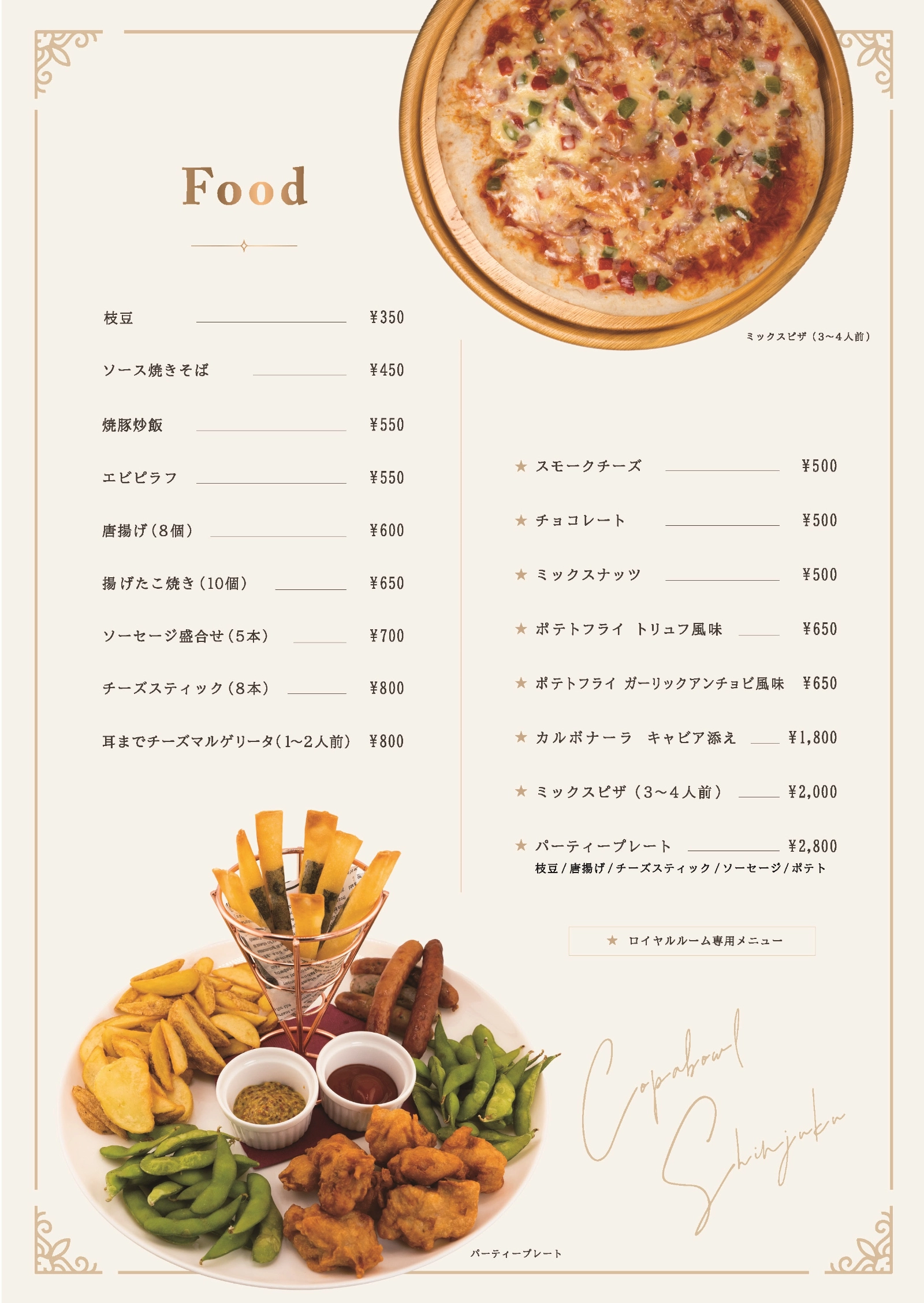 枝豆・フライドポテト・から揚げ・キャビアのせカルボナーラ・デザート