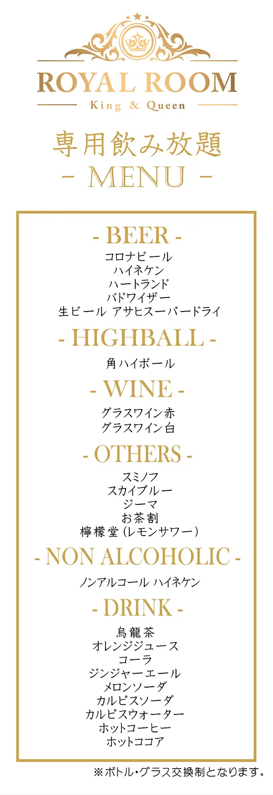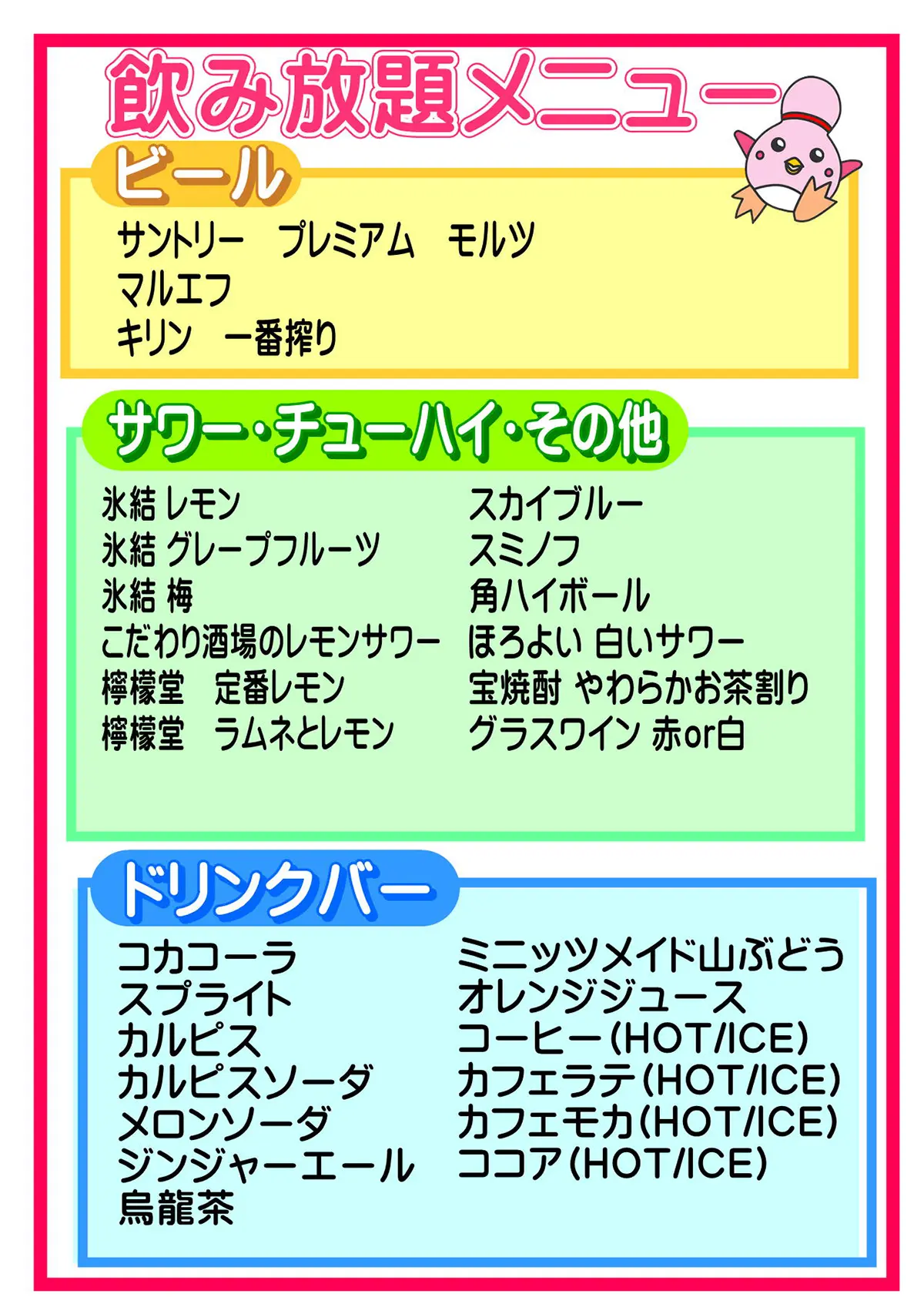大人気の瓶物や各種サワーはもちろん、ワイン・ソフトドリンクも飲み放題です。