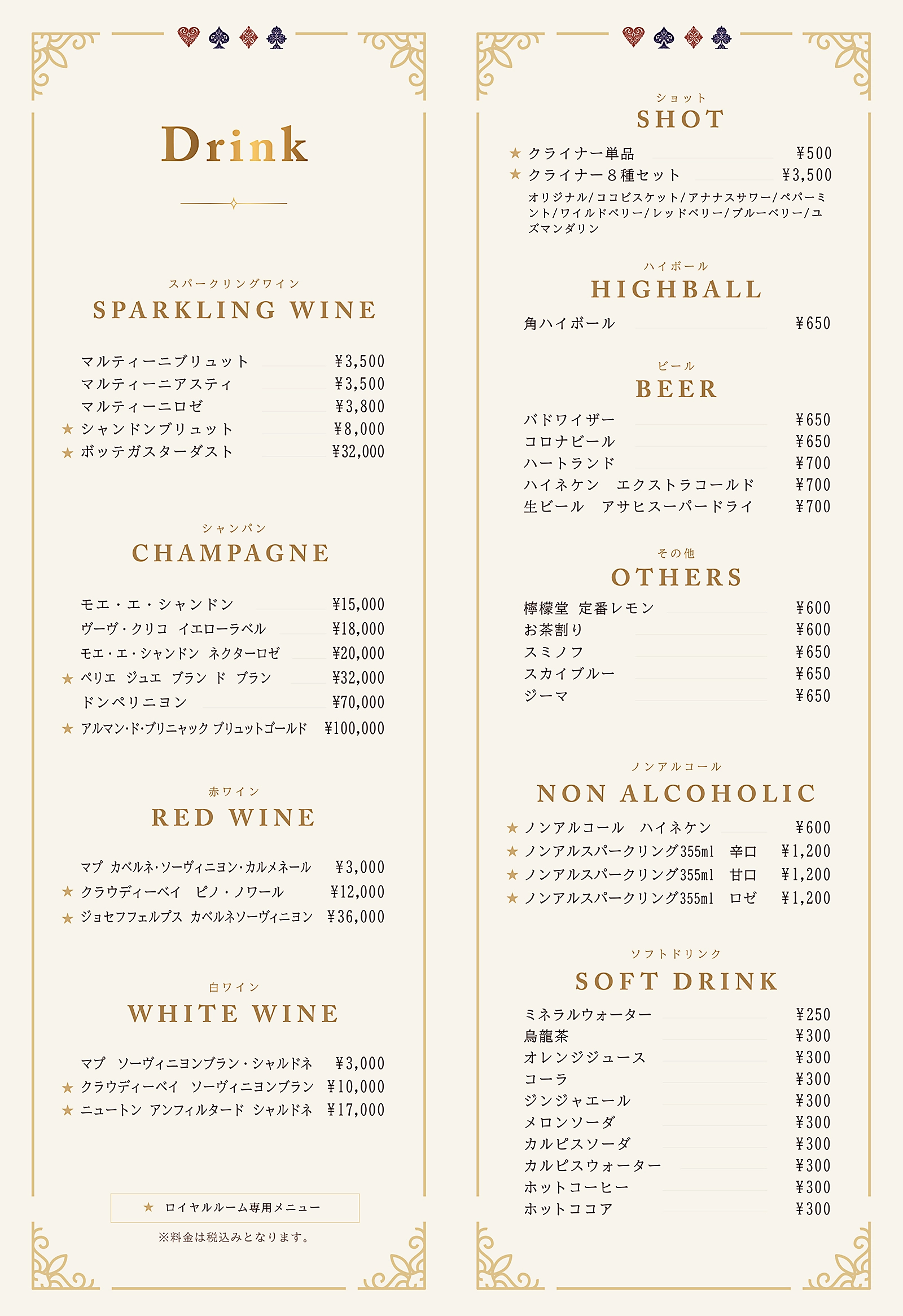 キンキンに冷えた生ビールや豊富な種類のサワーはもちろん、歌舞伎町ならではのワインや高級シャンパンもご用意。