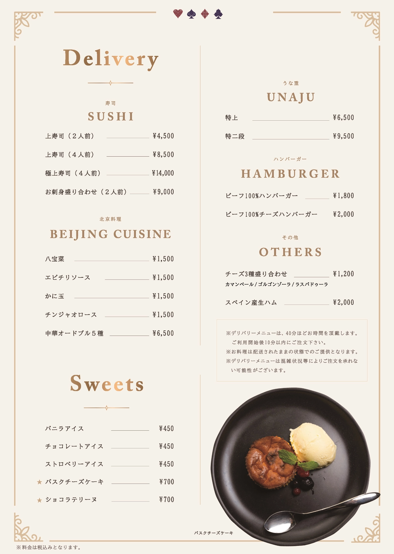 ロイヤルルーム専用のワンランク上の飲食メニューをご用意しております。お寿司やうな重などのデリバリーも、テーブルオーダーでご注文いただけます。