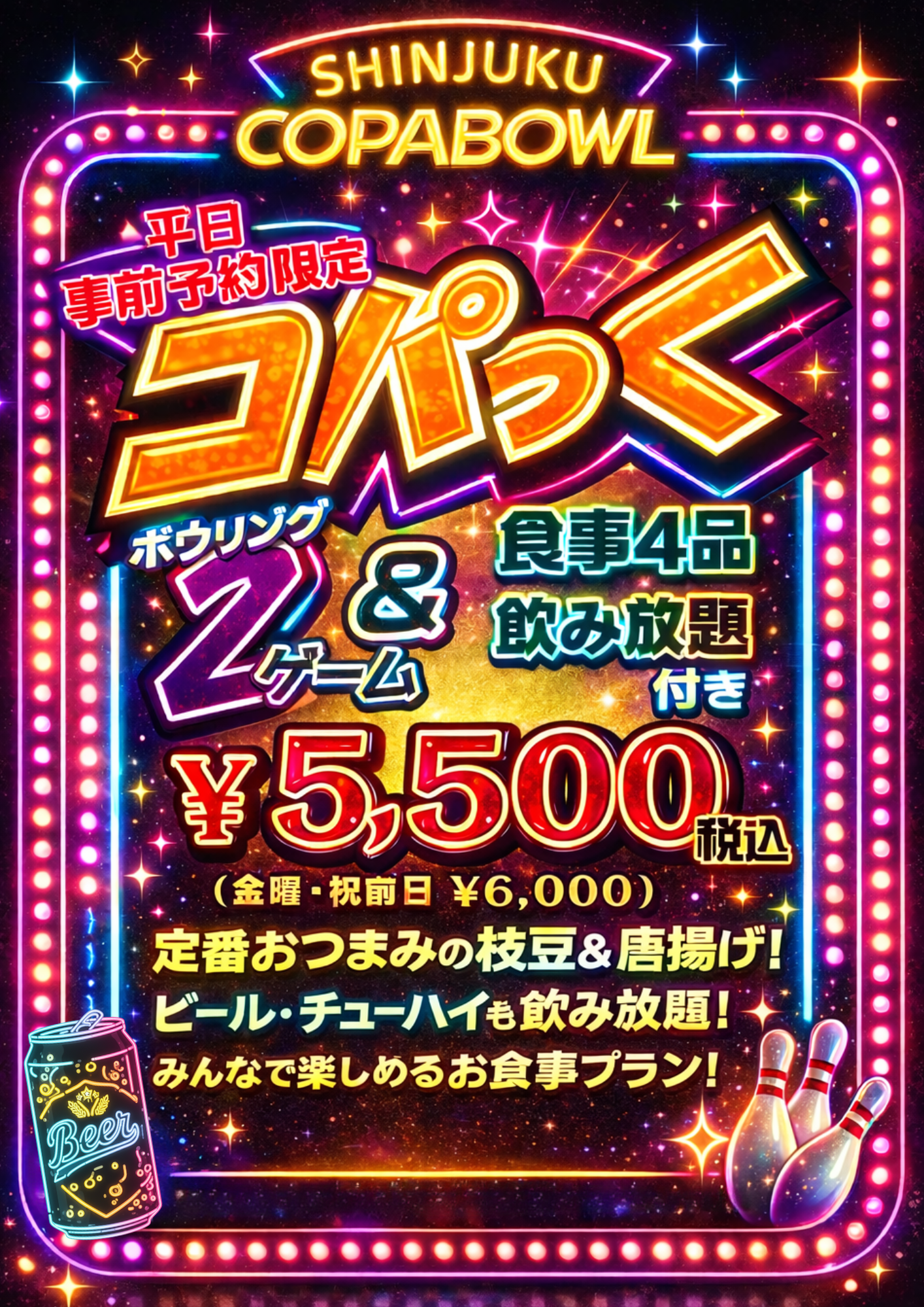 ボウリング2ゲーム + ガッツリ食事&飲み放題、赤字覚悟のお得なプラン。